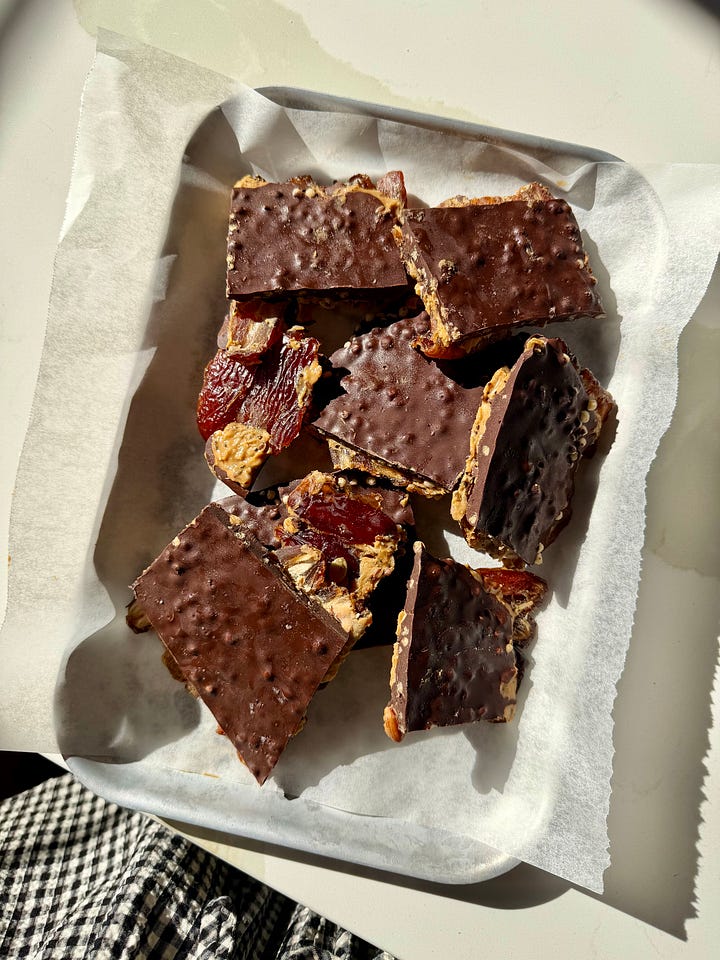 Chocolate + peanut butter = a match made in heaven…so it’s no surprise my Everything Butter Date Bark has a permanent place in my freezer (and heart). 💛